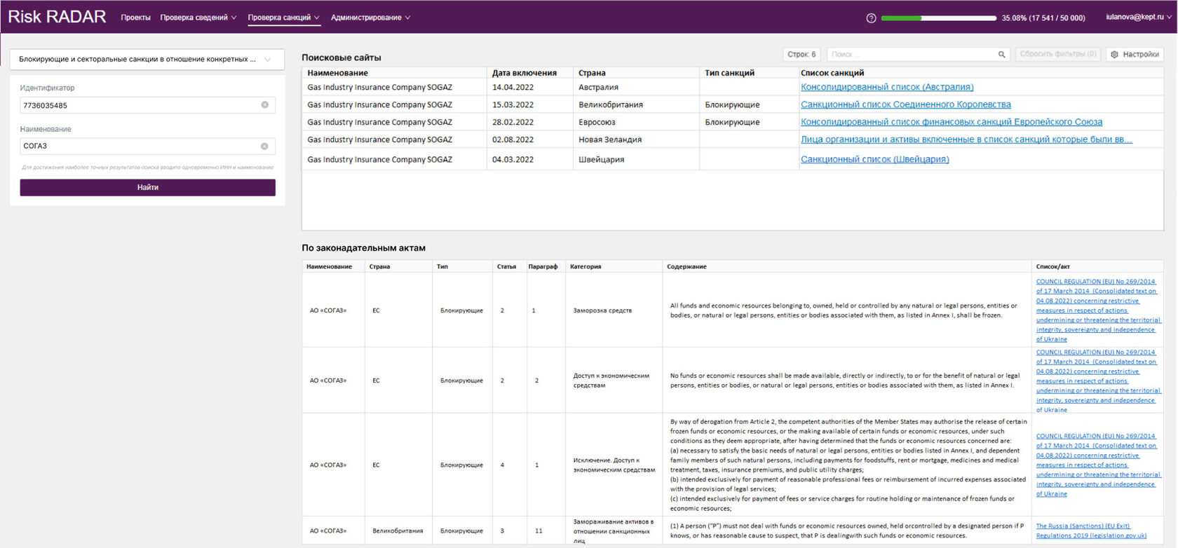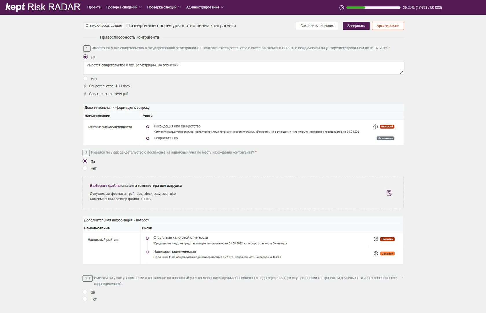 Kept Risk RADAR offers six modules which may be used separately. Checks may be conducted both in "single" mode (for a certain legal entity or individual) and "batch" mode (for many third parties and employees). Risk monitoring facilitates repeated checks and provides updates to the results of the analysis