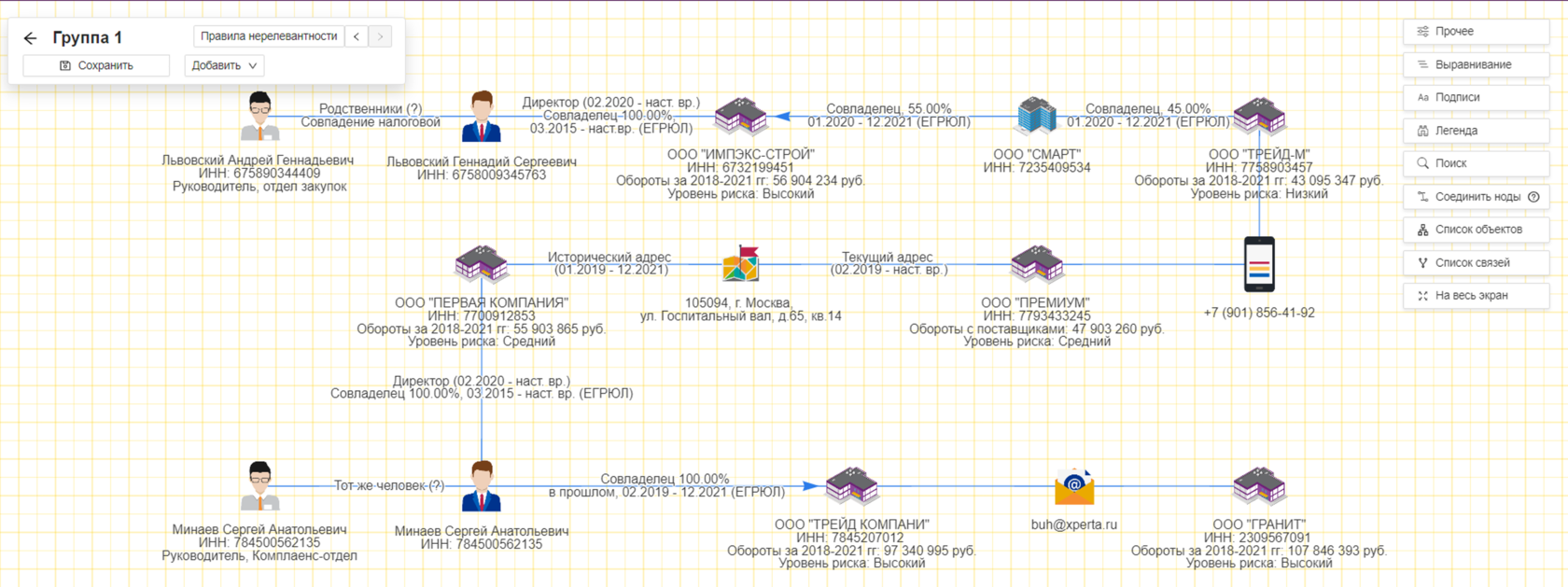 Identification and visualization of affiliations between third parties, detection of potential conflicts of interest This functionality reduces time costs of the compliance and legal department for ensuring compliance with regulatory requirements.